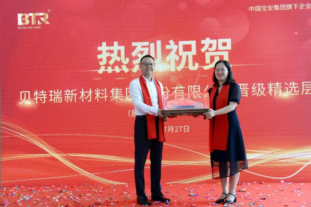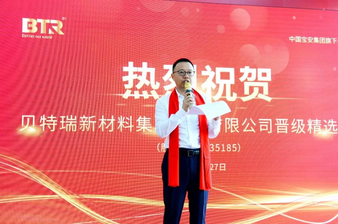 國信證券副總裁諶傳立先生對貝特瑞成功晉級精選層表示衷心的祝賀,并祝愿貝特瑞的未來越來越好。貝特瑞集團(tuán)老員工代表、高級副總經(jīng)理?xiàng)罴t強(qiáng)先生發(fā)表宣言“愿帶領(lǐng)貝特瑞員工、團(tuán)隊(duì)共同奮戰(zhàn),成就貝特瑞新的輝煌”。中國寶安集團(tuán)董秘郭山清先生代表中國寶安集團(tuán)對貝特瑞成功晉級精選層表示熱烈的祝賀,并堅(jiān)信,有各位嘉賓的大力支持、有全體員工的不懈努力,相信貝特瑞一定能成為新能源材料領(lǐng)域全球領(lǐng)先企業(yè)。